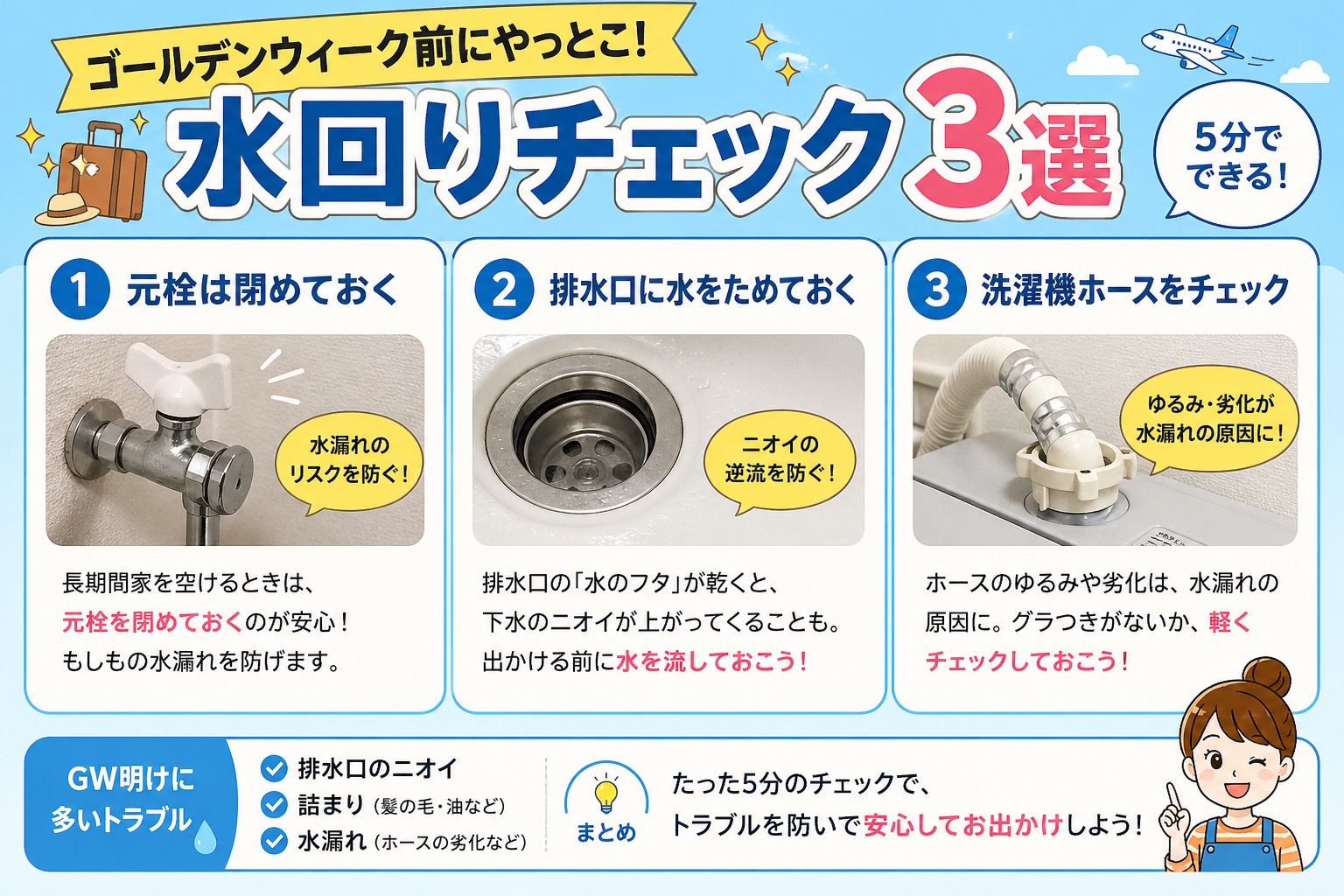 お家を空ける前に、たった5分チェックで、ほとんどのトラブルが防げます。